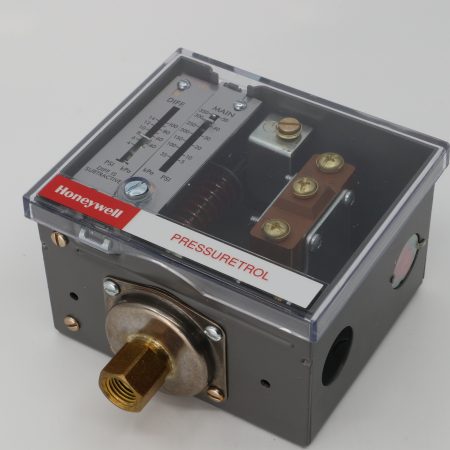 Honeywell Pressuretrol Controller, 5-50 PSI Operating Pressure Range, 6-14 PSI Differential Pressure,SPDT Snap Action, Make R-W, Break R-B on Pressure Rise, For Use with Steam, Air, Noncombustible Gases or Non Corrosive Fluids, 120Vac/240Vac, Mount using 1/4″NPT Internal Pipe Threads or Surface Mount Through Base of Glass