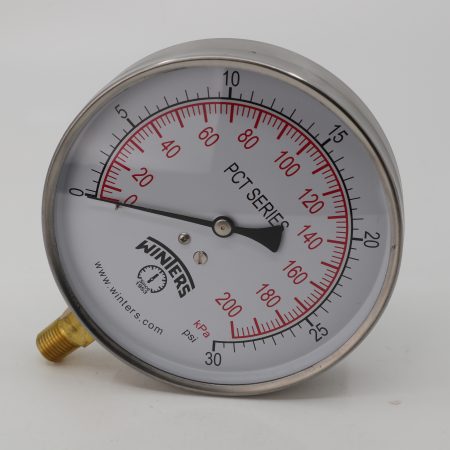 WINTERS 4 1/2″ DIAL CONTRACTOR PRESSURE GAUGE 1/4″ NPT BOTTOM CONNECTION RANGE: 0 – 30 P.S.I.